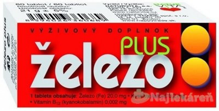 Do obchodu NajlekarenVýživový doplnok Železo plus: železo prispieva k správnej tvorbe červených krviniek a hemoglobínu, k správnemu fungovaniu imunitného systému, k zníženiu vyčerpania a únavy Kyselina listová (folát) prispieva k správnej tvorbe krvi, k správnej funkcii psychiky, k správnemu fungovaniu imunitného systému, k správnej látkovej premene dôležitej pre tvorbu energie. Vitamín B12 prispieva k správnej látkovej premene dôležitej pre tvorbu energie, k správnemu fungovaniu nervového systému, k správnej tvorbe červených krviniek. Účinné látky: mg/tbl Železo (Fe) 20,0 Kyselina listová (folát) 0,2 Vitamín B12 (kyanokobalamin) 0,002 Viac na adcc.sk